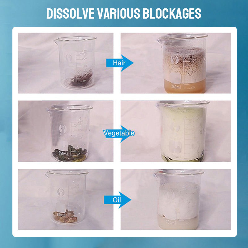 * Powerful Function: It can quickly dissolve pipe blockages such as hair, paper, soap scum, vegetables, fruits, food residue, grease, and organic matter.