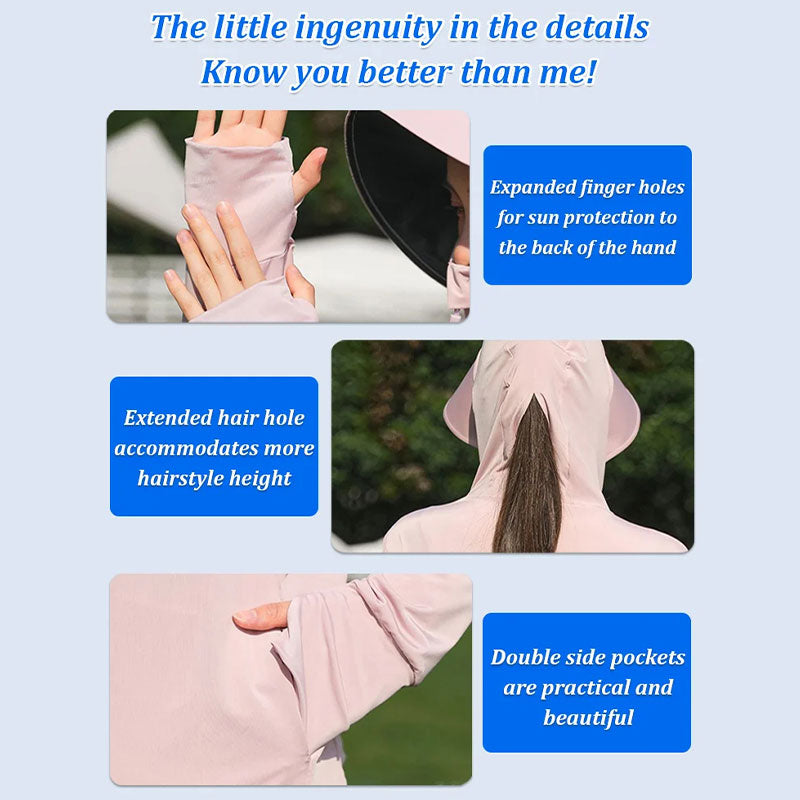 USER-FRIENDLY DESIGN: Add holes at the fingers so that the back of the hands can also be protected from the sun. Additionally, the extended hair opening allows for accommodating different hairstyle height. With the addition of dual side pockets, this jacket not only offers practical functionality but also enhances its overall aesthetic appeal.