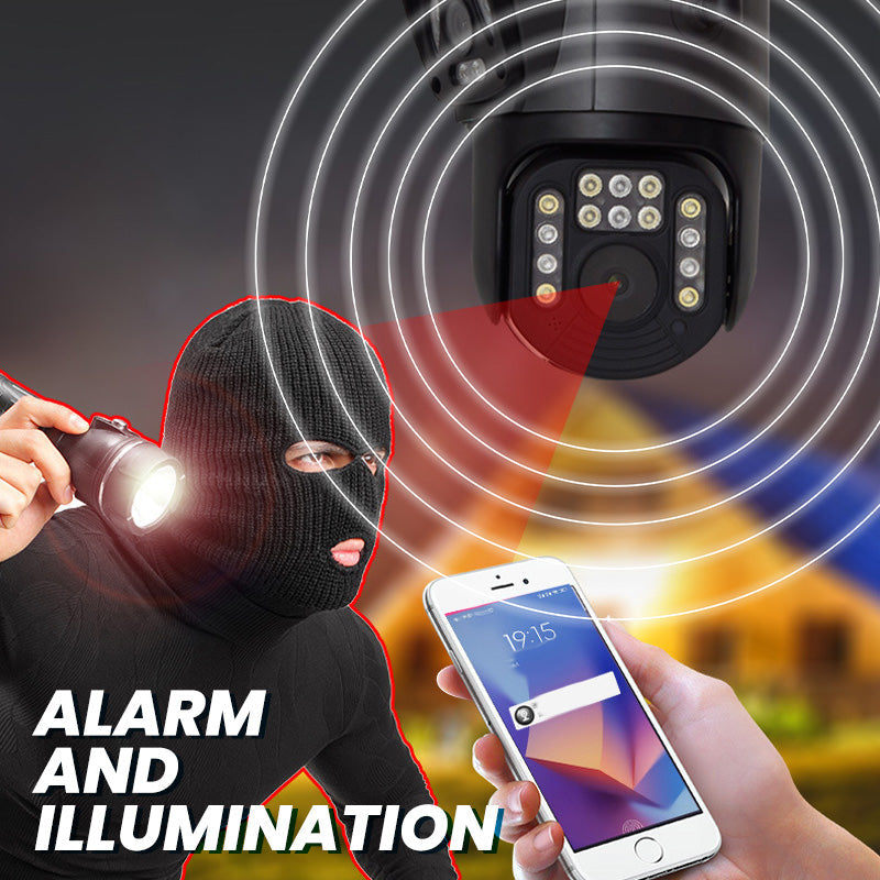 ALARM AND ILLUMINATION: In case of unusual activity, the camera triggers an alarm and lights up. It sends instant alert notifications to your device, keeping you informed of potential security issues.