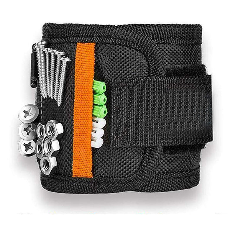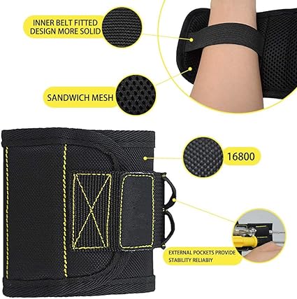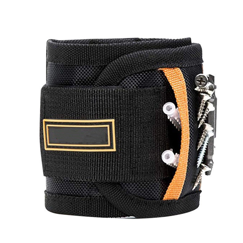Portable Magnetic Wristband is comprised and assembled with strong magnets to be able to hold screws, nails, drill bits, and many other tools at your disposal while keeping your hands free. Perfect for electricians, plumbers, mechanics, handy-men or handy-women!